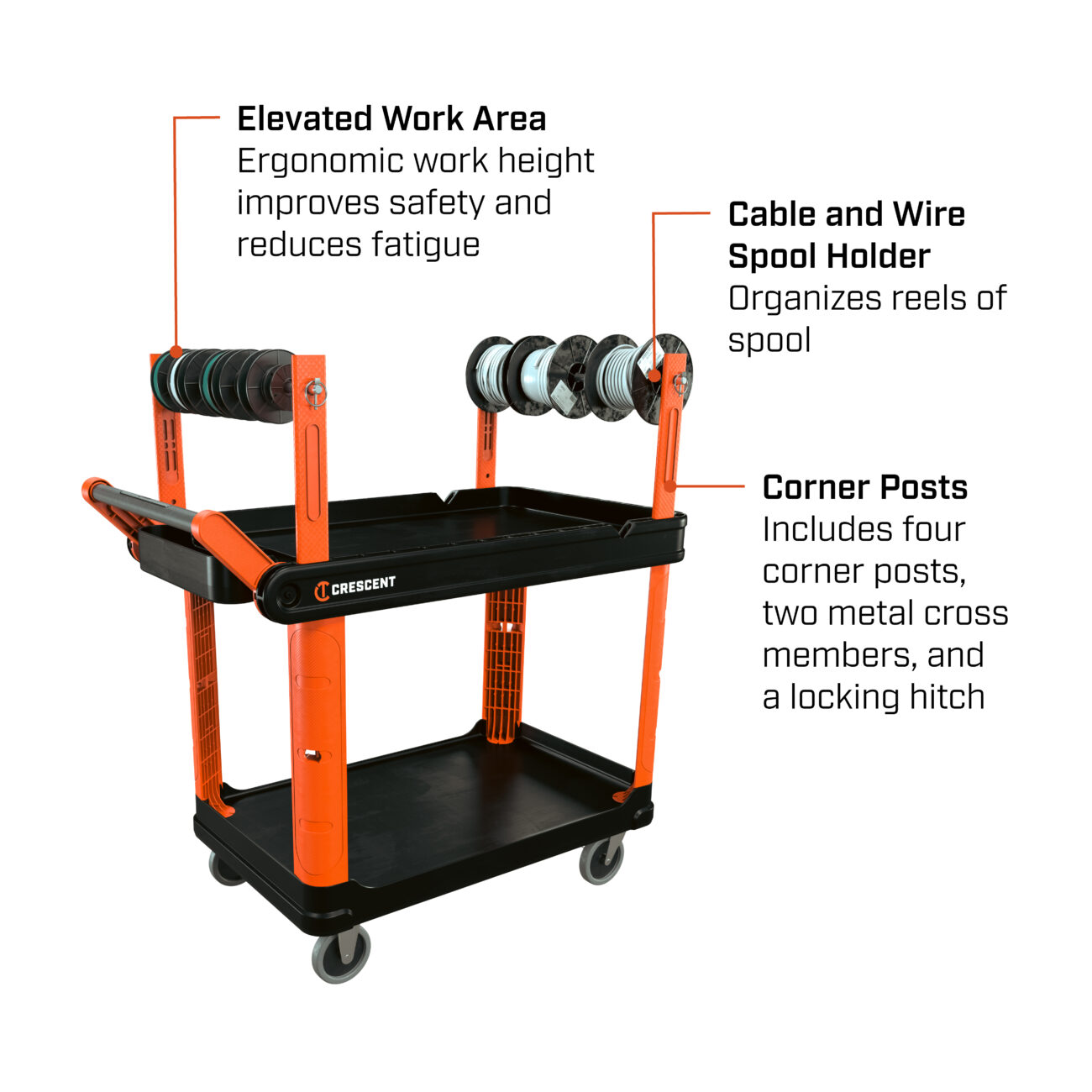 For electricians, the wire spool holders, secure storage options, and workstation accessories make it easy to turn a cart into a mobile wire-pulling and tool organization setup.