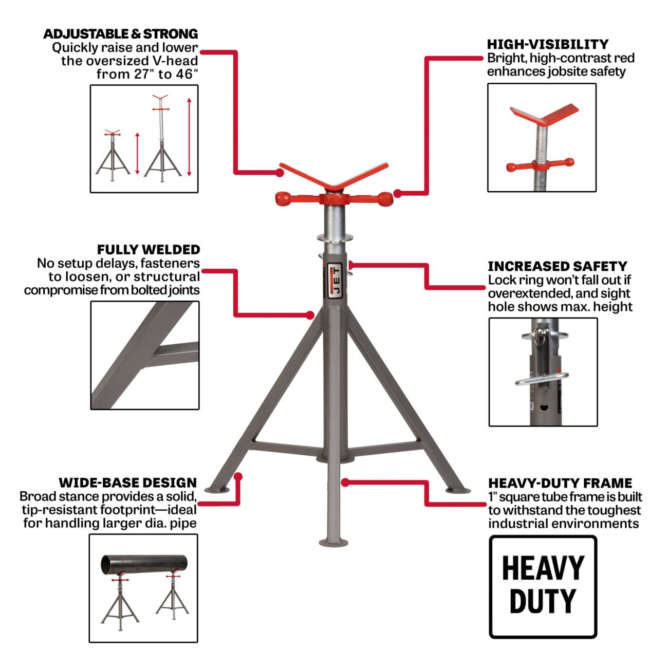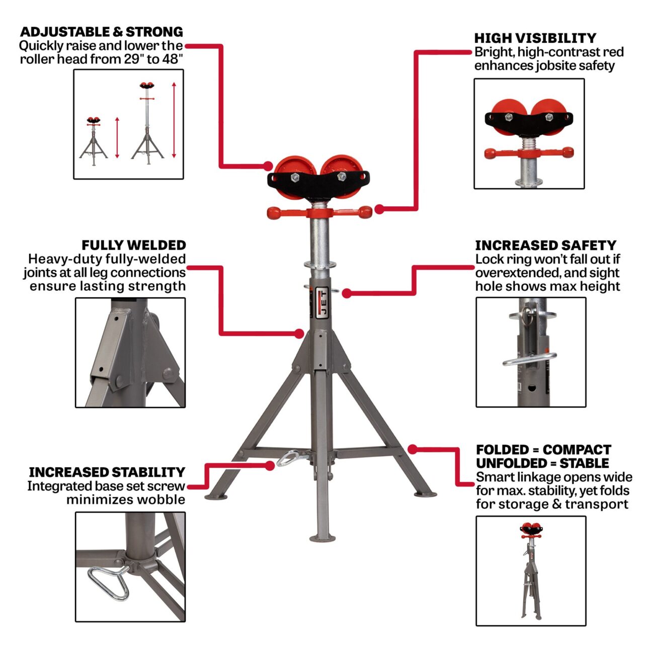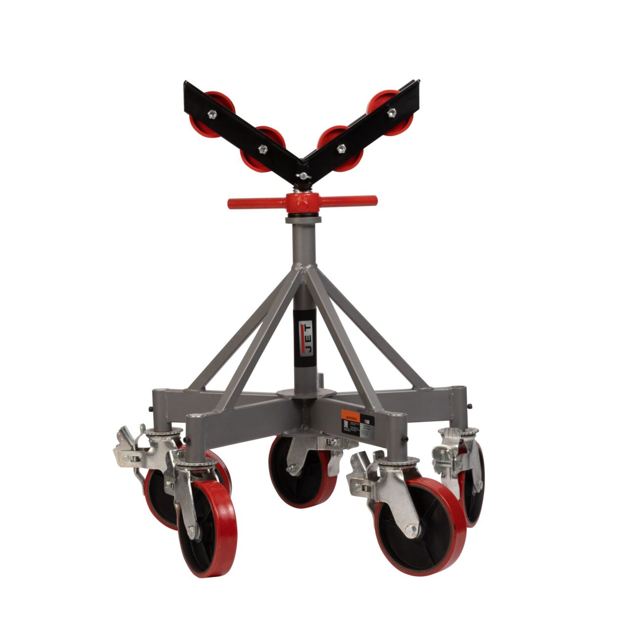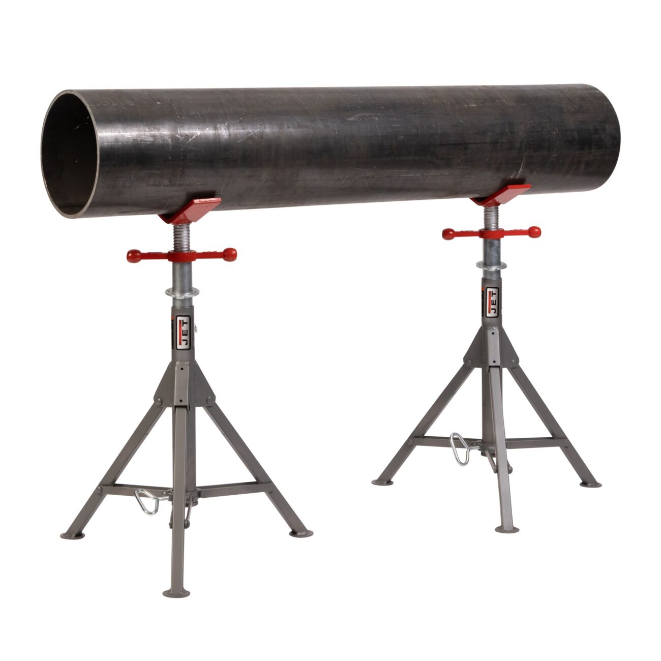 JET’s latest pipe handling lineup is engineered to raise the standard of reliability. Each stand supports up to 2,500 pounds and accommodates pipe up to 36 inches in diameter, giving tradesmen the confidence to tackle even the most demanding projects. Every unit includes high-visibility red touch points, dual lock mechanisms, and over-extension sight holes for clear safety awareness on the job.