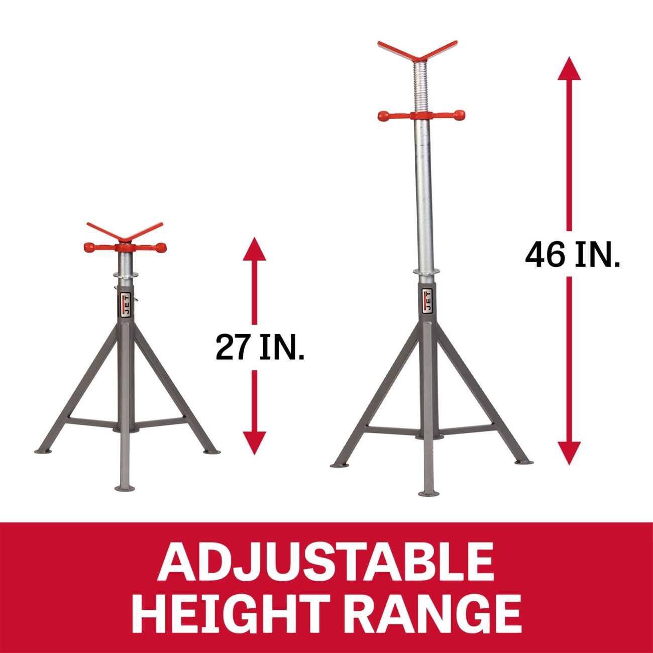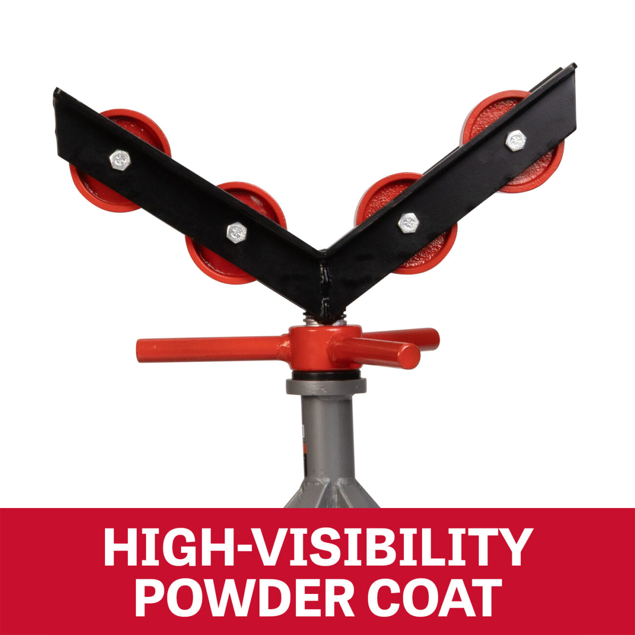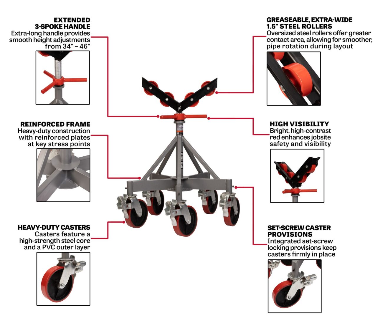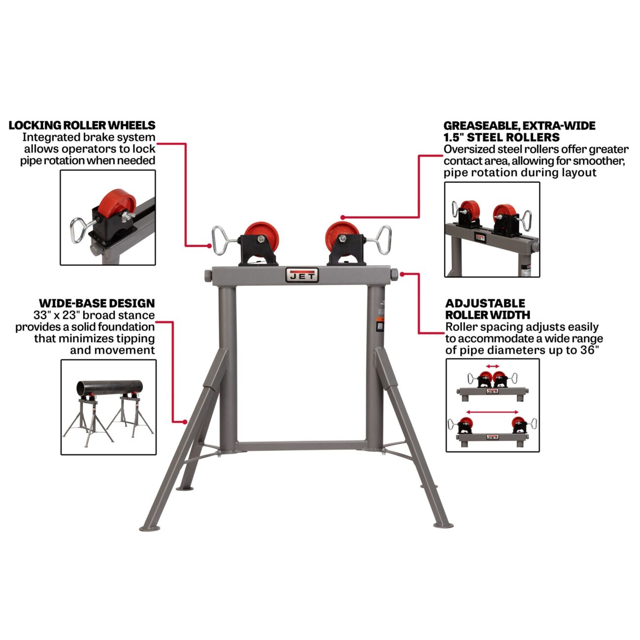 JET’s latest pipe handling lineup is engineered to raise the standard of reliability. Each stand supports up to 2,500 pounds and accommodates pipe up to 36 inches in diameter, giving tradesmen the confidence to tackle even the most demanding projects. Every unit includes high-visibility red touch points, dual lock mechanisms, and over-extension sight holes for clear safety awareness on the job.