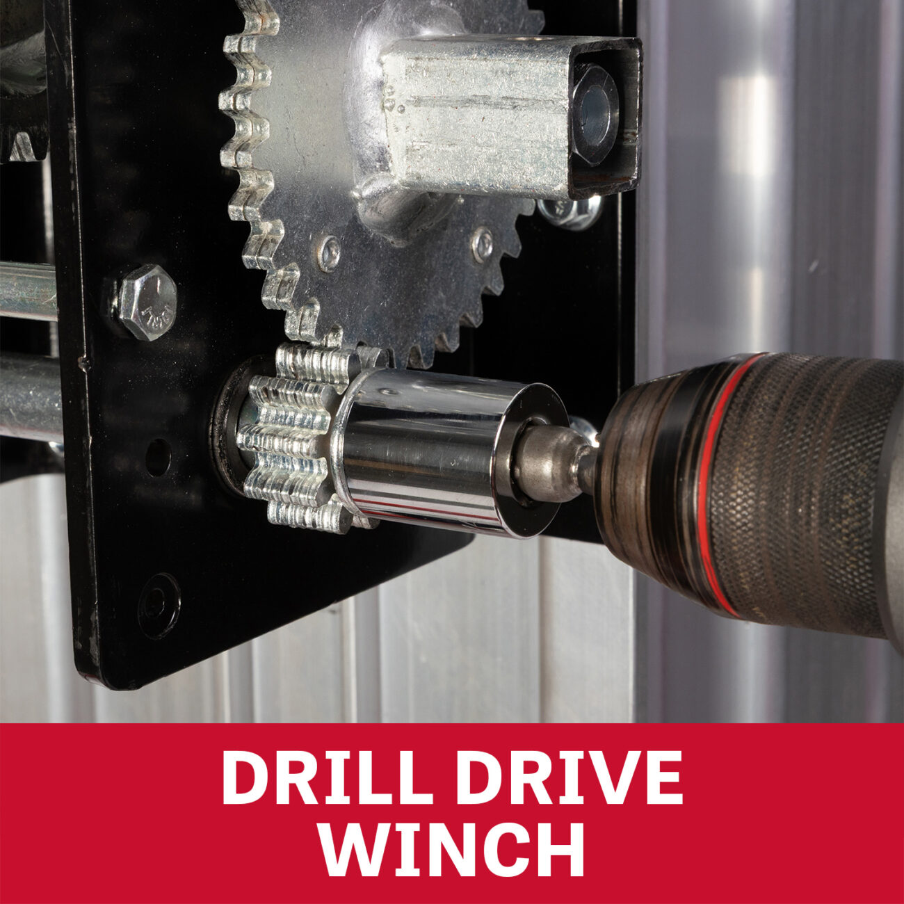 Each model features a drill-drivable dual winch system, letting you power the lift with a cordless drill or hand crank. A patent-pending tilting mast design allows easy movement through doorways, while integrated forklift pockets and six-inch casters make transport and positioning effortless. The wide base and internal mast brake system provide outstanding stability and confidence at full extension.