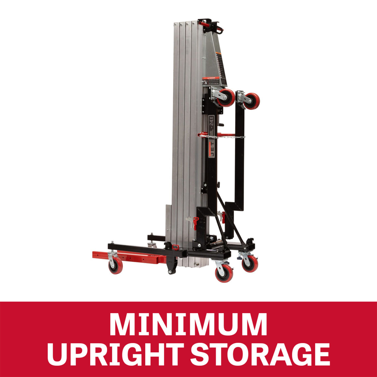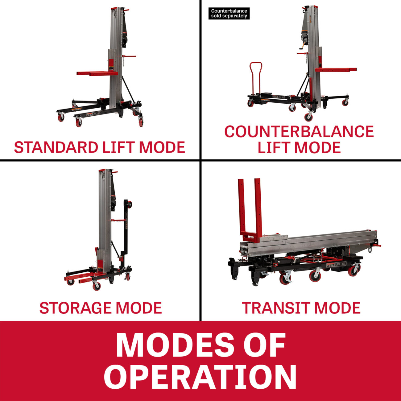 The JET Material Lift series offers four working configurations that make it adaptable to nearly any jobsite. Standard Lift Mode delivers reliable everyday performance, while Counterbalance Mode lets you lift flush against walls without obstruction using the optional Counterbalance Dolly (JET2594). When the job is done, Storage Mode allows the legs to fold upright to save space, and Transit Mode lets you tilt and roll the lift across the floor or through doorways safely and easily.