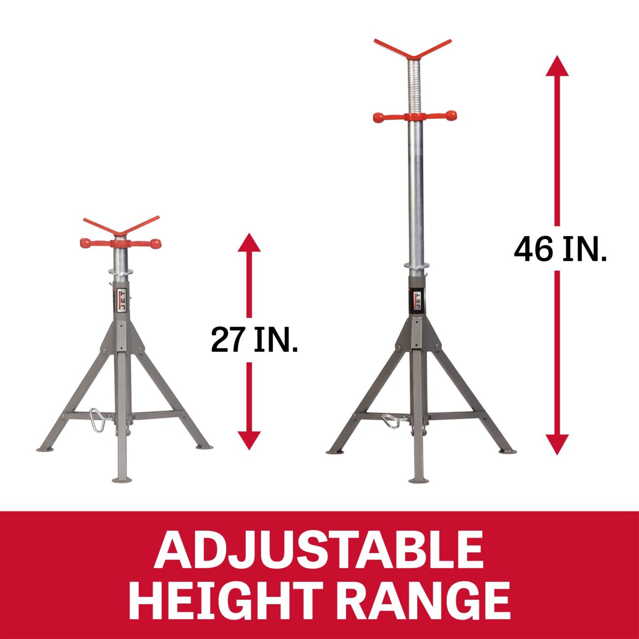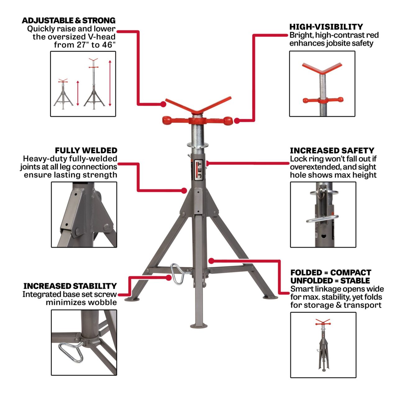 Adjustments are made simple through a 1-1/2” ACME screw shaft, giving you a range from 27” to 46” in height. The balanced carry handle and powder-coated red V-head improve both comfort and visibility, while safety features like the over-extension sight hole, captive lock ring, and integrated T-screw ensure reliable, secure operation. Like the rest of JET’s lineup, it’s backed by a 2-year warranty.