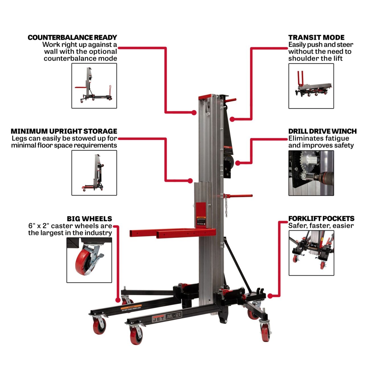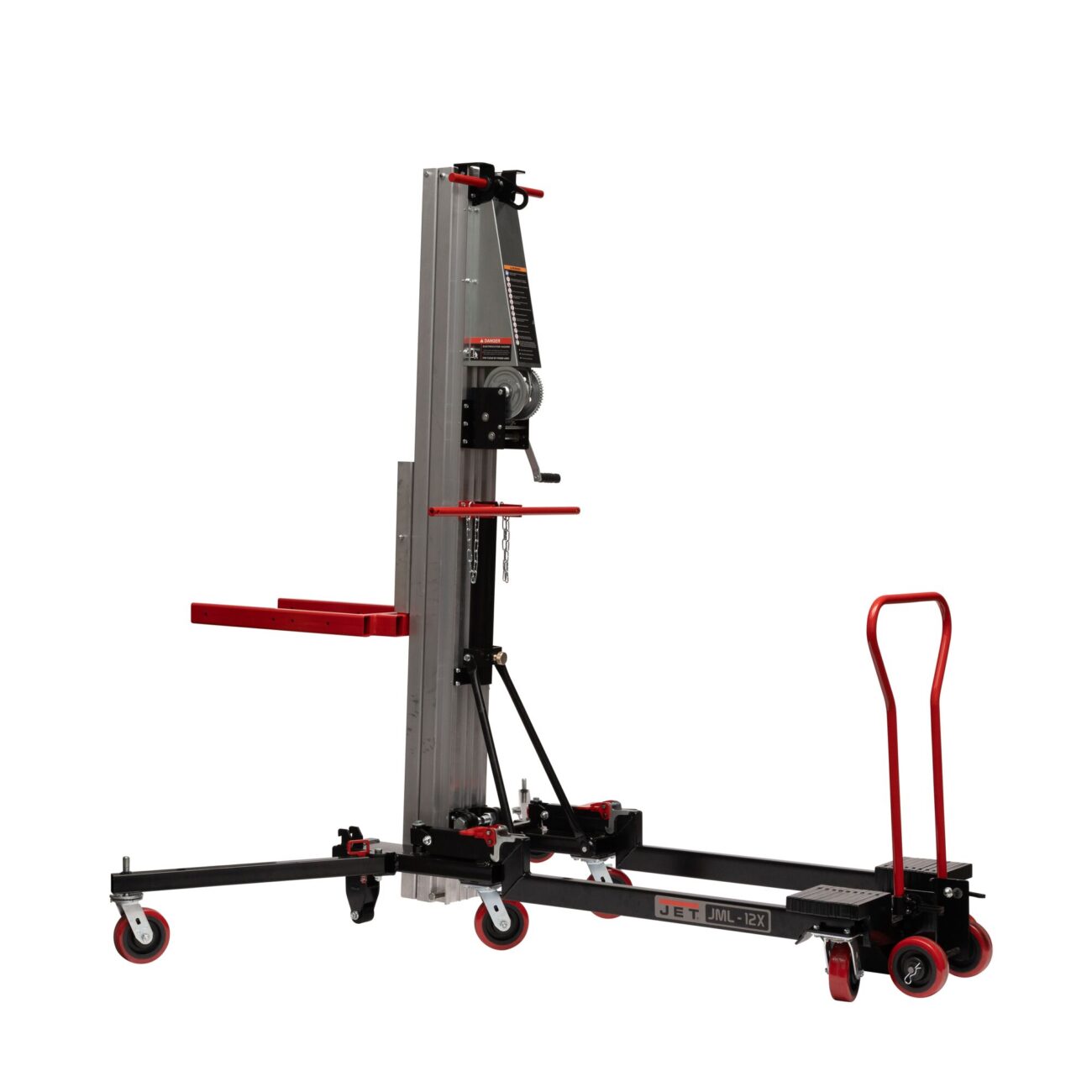 Compact yet powerful, the JET 12-foot Material Lift gives pros the ability to raise up to 650 pounds safely and efficiently. It’s perfect for maintenance and installation crews who need to move quickly from site to site. The drill-drivable winch eliminates manual strain, while the tilting mast and wide base keep operation smooth and controlled. Its internal safety brake locks the load in place, and the integrated forklift pockets make transport between work zones simple.