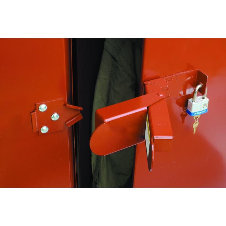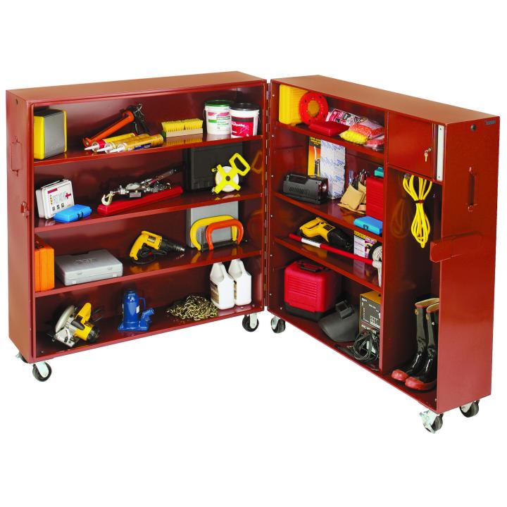 The Rolling Clam Shell Cabinet is the most mobile and versatile option of the group, making it ideal for jobsites that change daily or require storage to move with the crew. Its clamshell design, heavy-duty casters, and reinforced locking hasp make it a strong choice for mixed-use storage, combining PPE, tools, and tall safety items in one secure unit. This cabinet fits well on service jobs, facility maintenance routes, or projects where crews need locked storage that can roll between work zones without relying on forklifts or lifts.