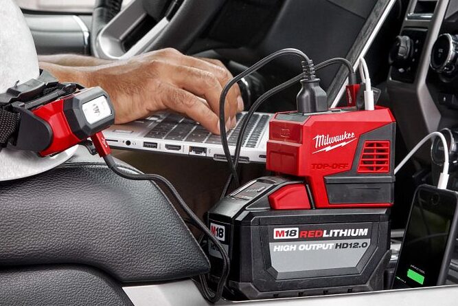 Milwaukee’s M18 TOP-OFF lineup is a great example of how modern jobsite demands are changing. Crews aren’t only thinking about power tools anymore, they’re thinking about everything that surrounds the work. Phones, tablets, headlamps, laptops, laser levels, small electronics, and mobile workstations have become part of daily workflow. So, when Milwaukee introduced TOP-OFF, the concept was simple: take the energy stored in an M18 battery and make it usable in the moments when wall power is inconvenient, far away, or simply unavailable.