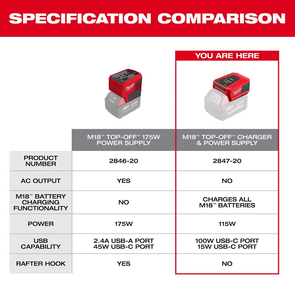 The confusion starts because Milwaukee currently offers two TOP-OFF tools that look almost identical at first glance. Both are portable power solutions built around M18 batteries, and both are meant to keep devices running while you’re away from a standard outlet. But in practice, they are designed for two different philosophies of power delivery. One is built as a power supply first, emphasizing flexibility through an AC outlet. The other is built as a charger first, centered around modern USB-C Power Delivery and the ability to charge the attached M18 battery when plugged into the wall. Once you recognize that difference, the lineup becomes far easier to understand.