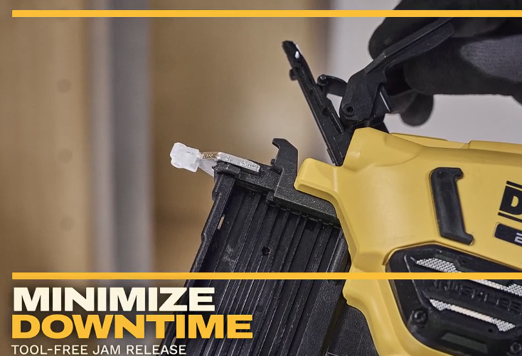 DEWALT has also kept the usability features that matter most in day-to-day work. Tool-free depth adjustment allows you to fine-tune nail placement depending on material density, while the tool-free jam release helps keep downtime to a minimum when fasteners bind. These are small details, but they make a noticeable difference over the course of a full workday.