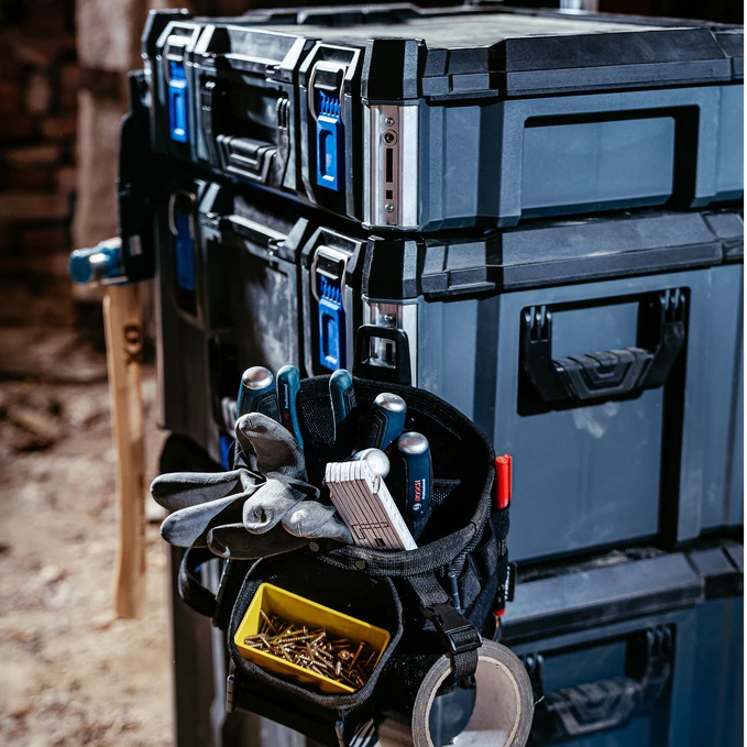 One of the most exciting upgrades in the Contractor Line is the built-in ProClick compatibility. The integrated aluminum rails allow you to attach electrician pouches, drill holsters, fastener bags, tech bags, maintenance kits, tool pouches, and specialty organizers, all with simple one-hand mounting. This turns every Contractor Box into a hybrid system: a toolbox, a tool belt, and a mobile workstation all in one.