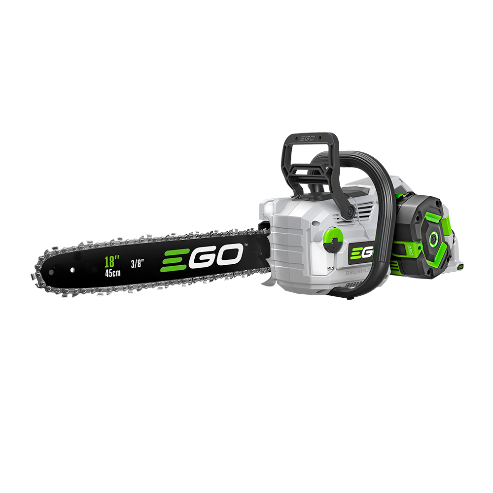 EGO’s 18″ chainsaw aims squarely at 50cc gas performance, minus the fumes. A 2500W brushless motor spins the chain up to 22 m/s for fast cuts, while toolless tensioning, aggressive bucking spikes, a speed-select mode, and a bright on-tool LED display help you work smarter. With a 6.0Ah battery, EGO is touting up to 320 cuts on 4×4 (application-dependent, of course).